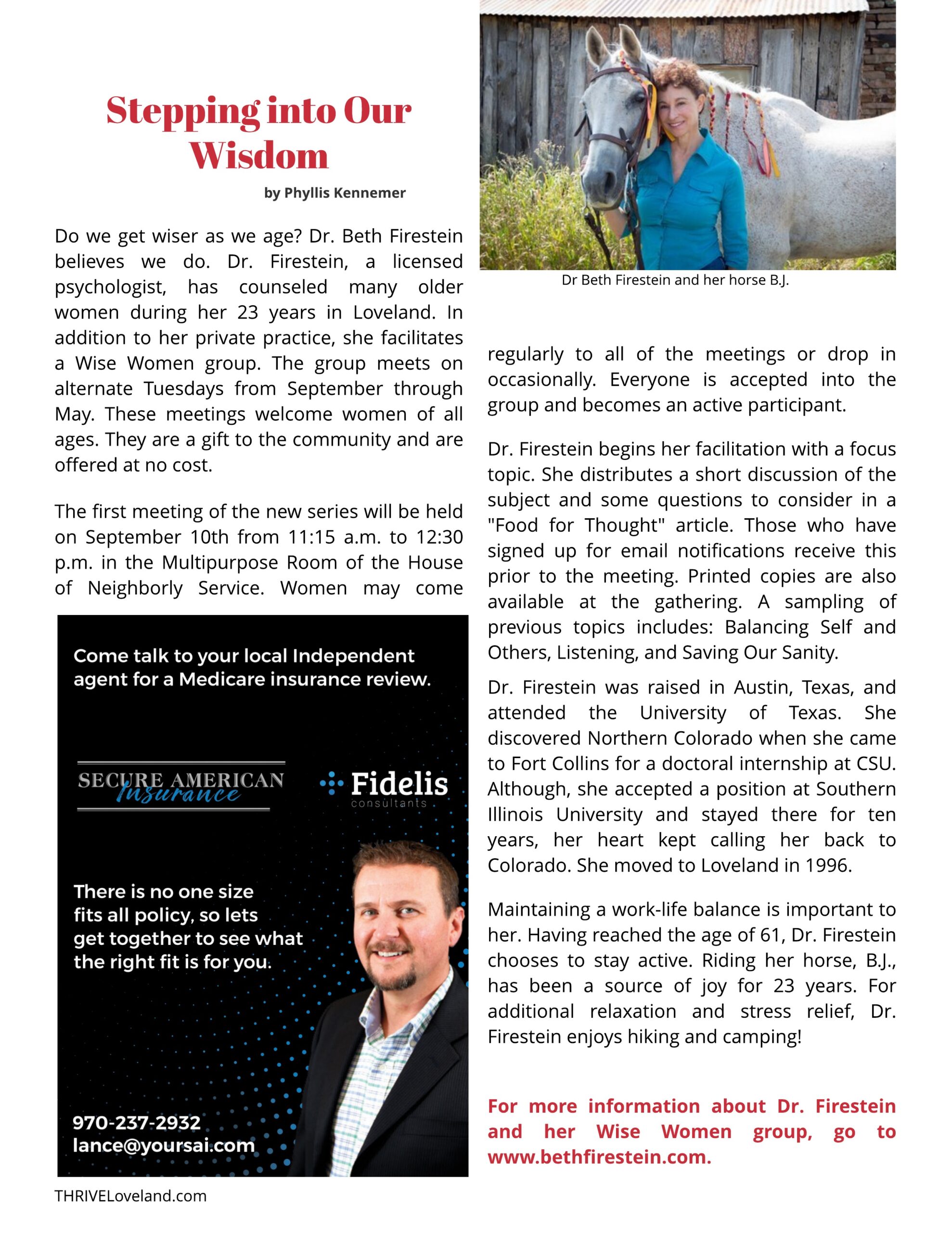 Do we get wiser as we age? Dr. Beth Firestein believes we do. Dr. Firestein, a licensed psychologist, has counseled many older women during her 23 years in Loveland.